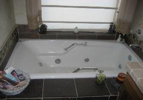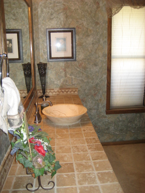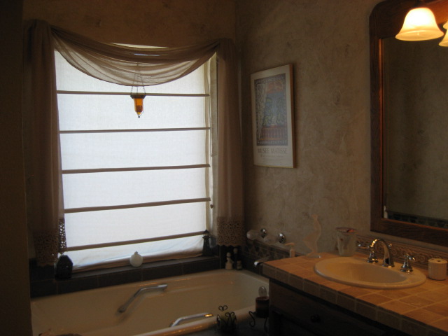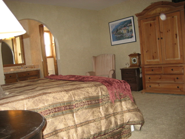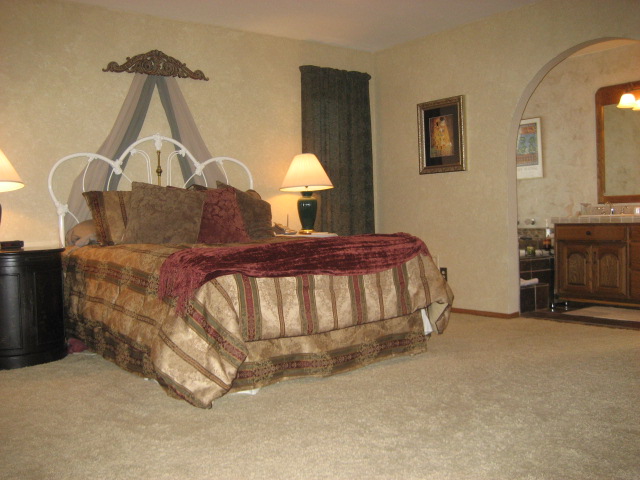 Master Bedroom and Bath with Jacuzzi jetted tub, separate tiled shower, tumbled travertine counters